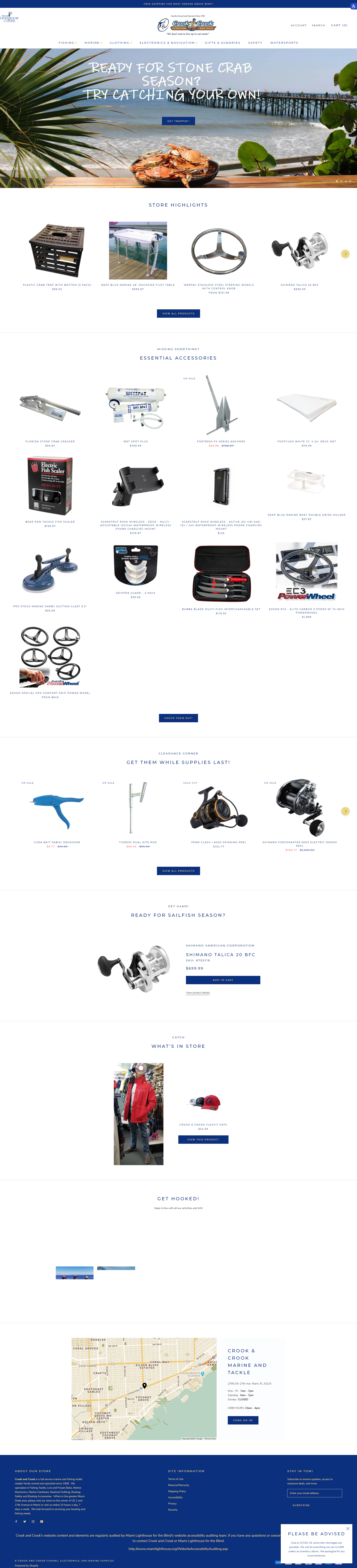 Crook and Crook is a full service marine and fishing tackle retailer family owned and operated since 1958. We specialize in Fishing Tackle, Live and Frozen Baits, Marine Electronics, Marine Hardware, Nautical Clothing, Boating Safety and Boating Accessories. When in the greater Miami Dade area, please visit our store on the corner of US 1 and 27th Avenue in Miami or visit us online 24 hours a day, 7 days a week. We look forward to servicing your boating and fishing needs.